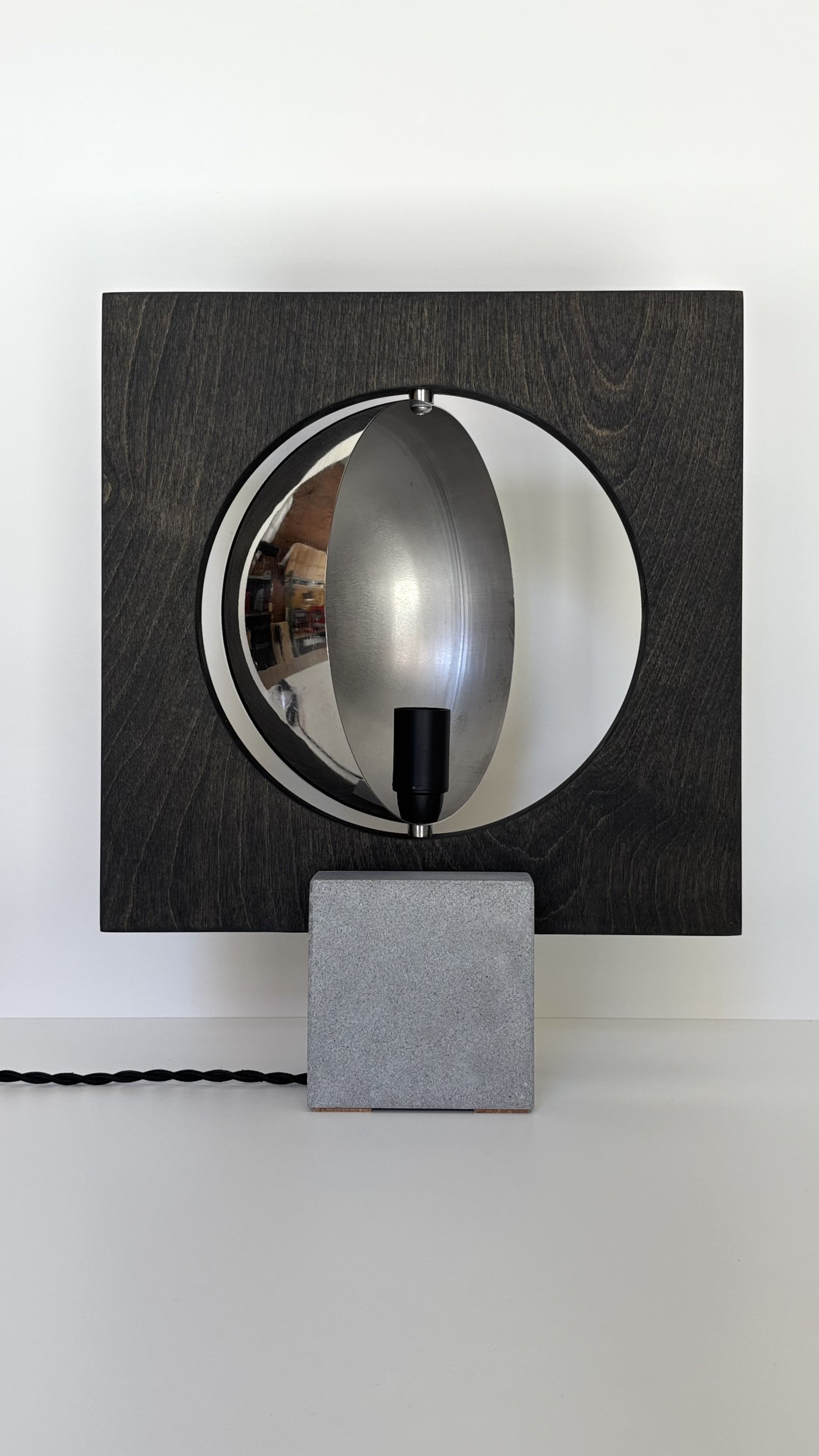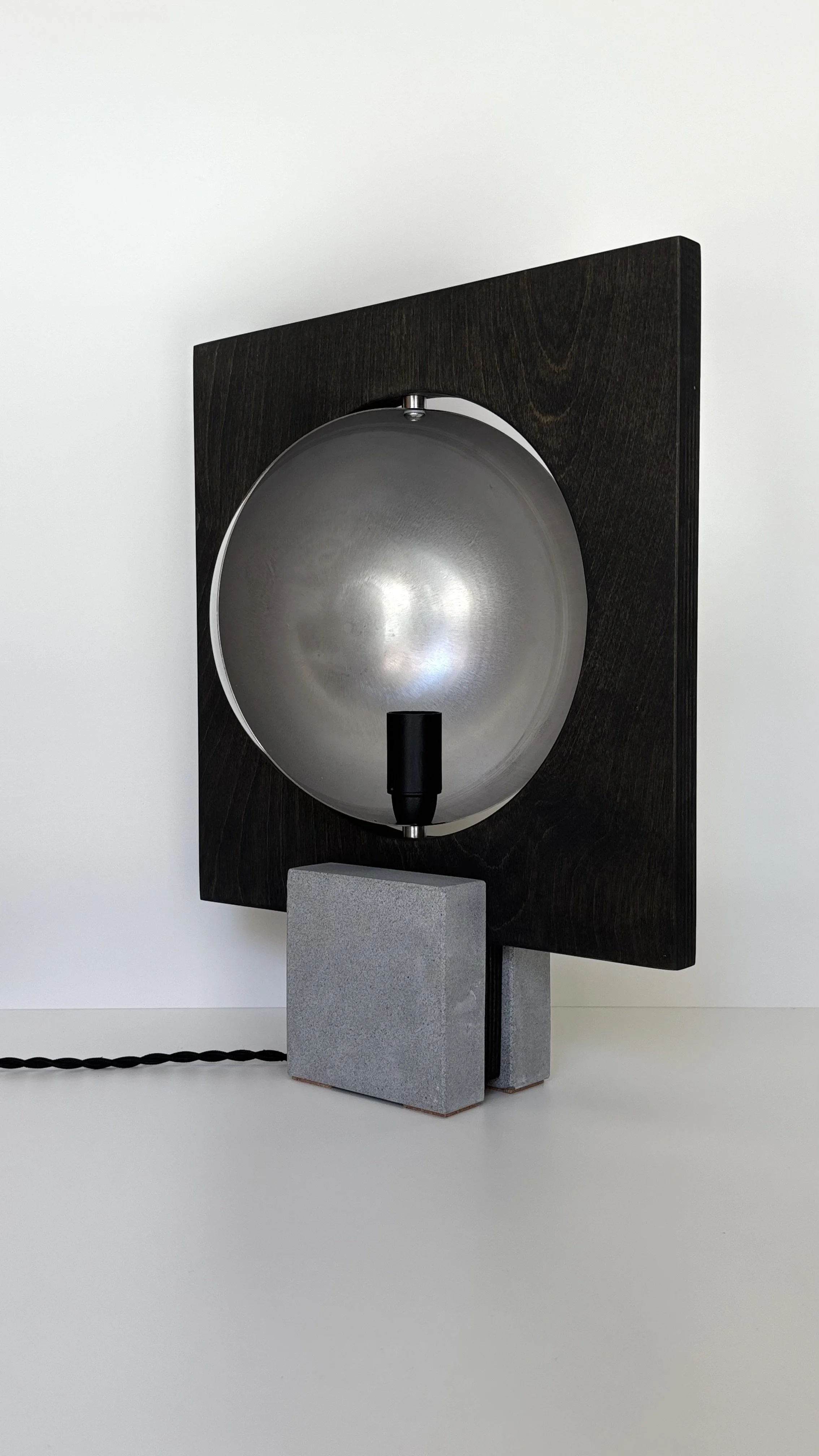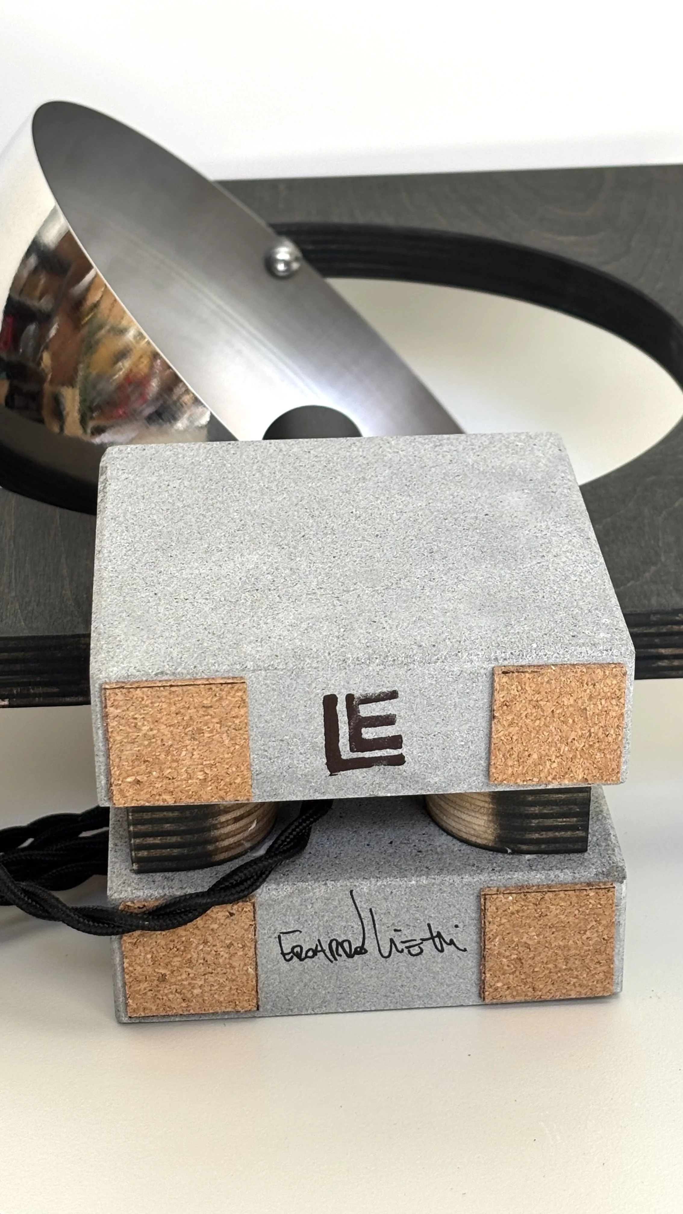 Material: Pietra Serena, natural pigment-stained birch plywood, and polished stainless steel. Features a 200 cm twisted cotton power cord with an ON/OFF switch. Includes an authenticity tag.