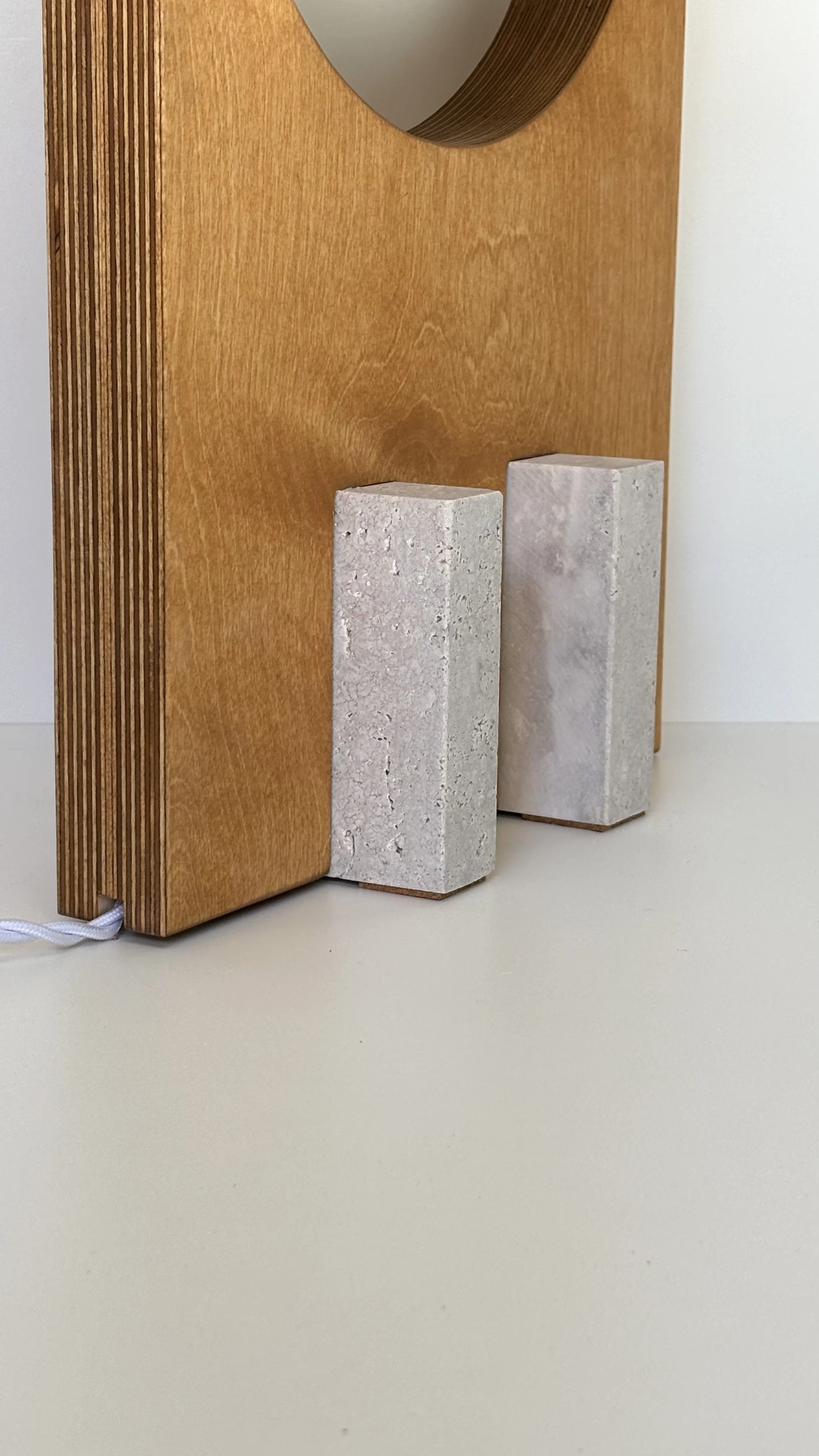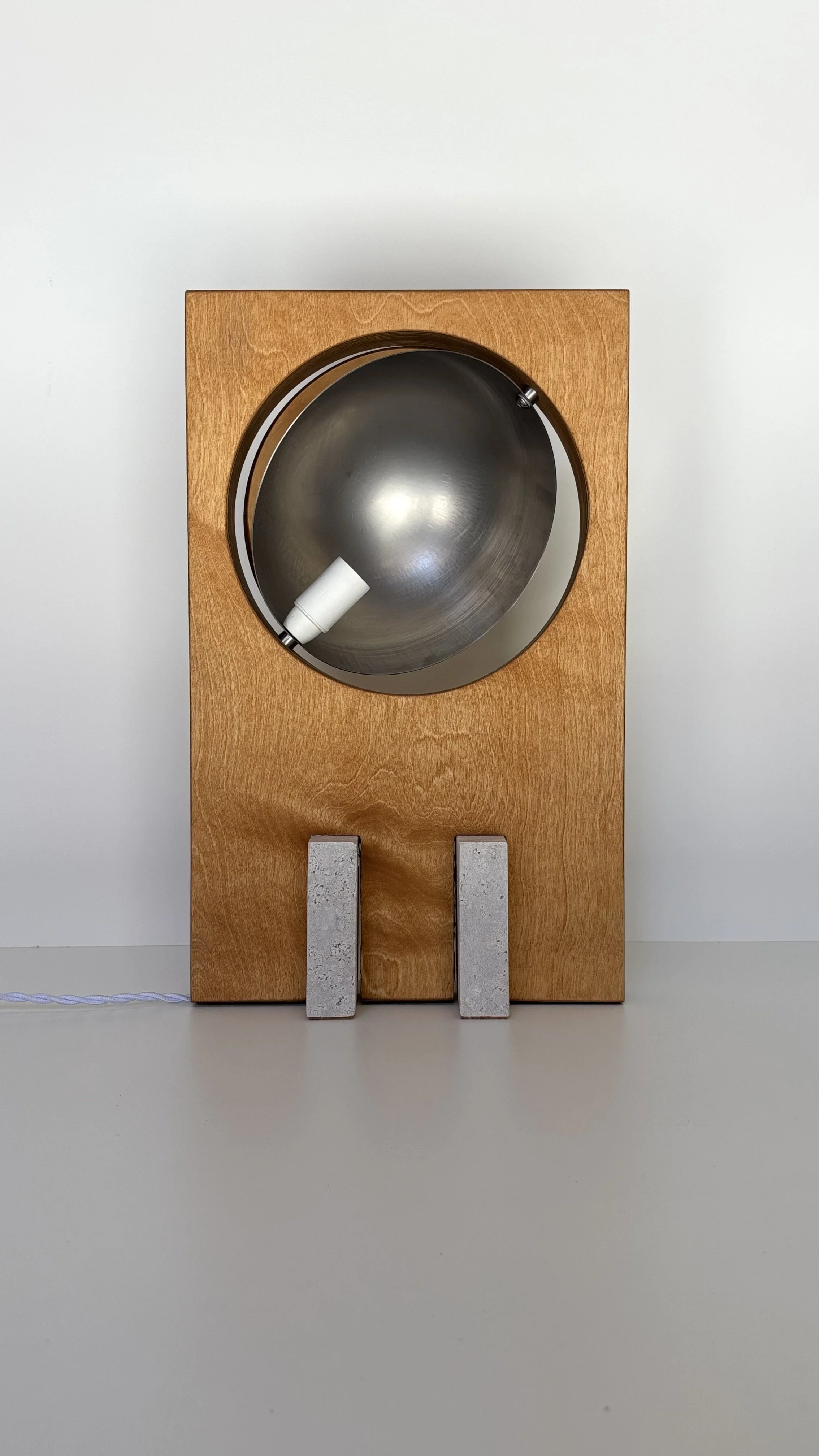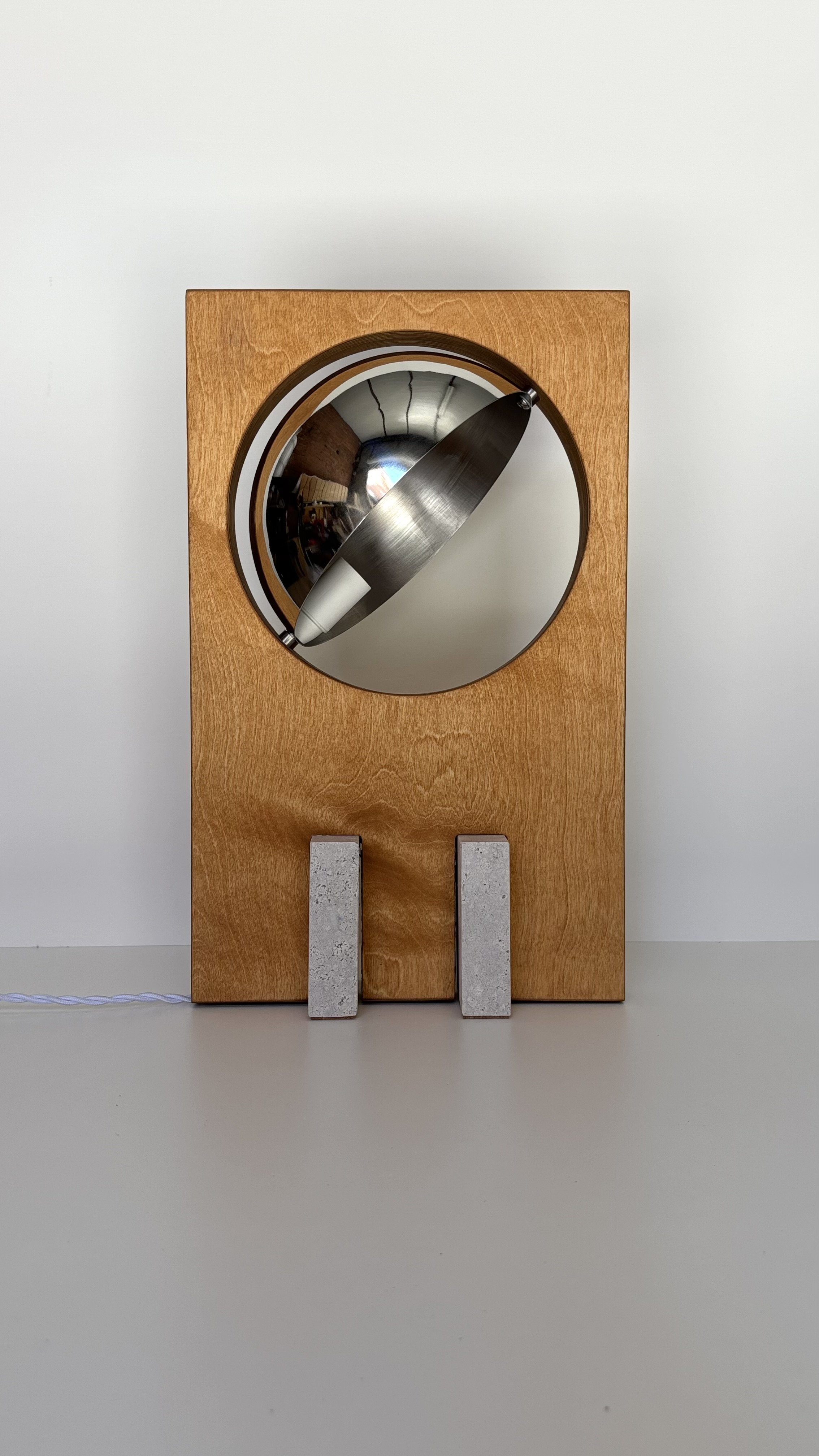 Material: Travertine Marble on birch plywood, polished stainless steel. Features a 200 cm twisted cotton power cord with an ON-OFF switch. Includes an authenticity tag.