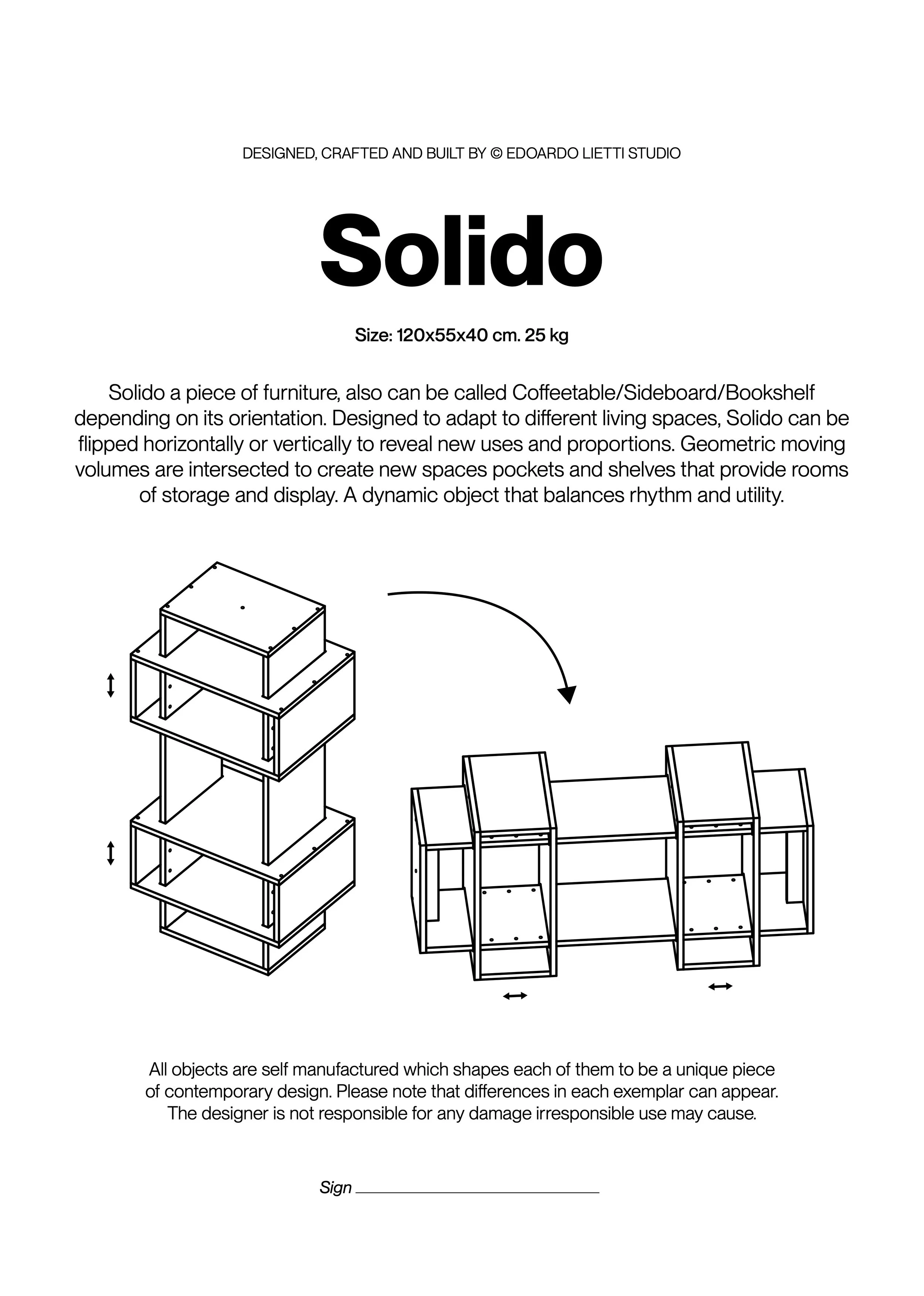Solido adapts to its surroundings. A coffee table, sideboard, or bookshelf, depending on how it’s placed. Its geometric volumes intersect to create dynamic spaces for storage and display. Flip it horizontally or vertically to transform its proportions and function. A refined balance of rhythm and utility, designed for modern living.