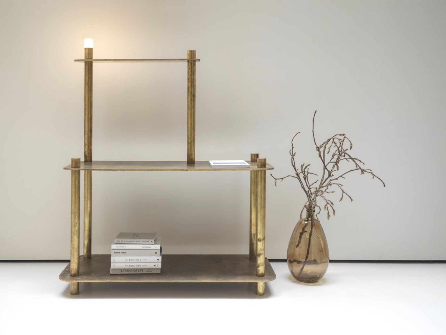 Is it furniture or a floor lamp? This crossover sheds the need for labels. A brutalist masterpiece to display books, art and more.Freestanding furniture - weathered brass