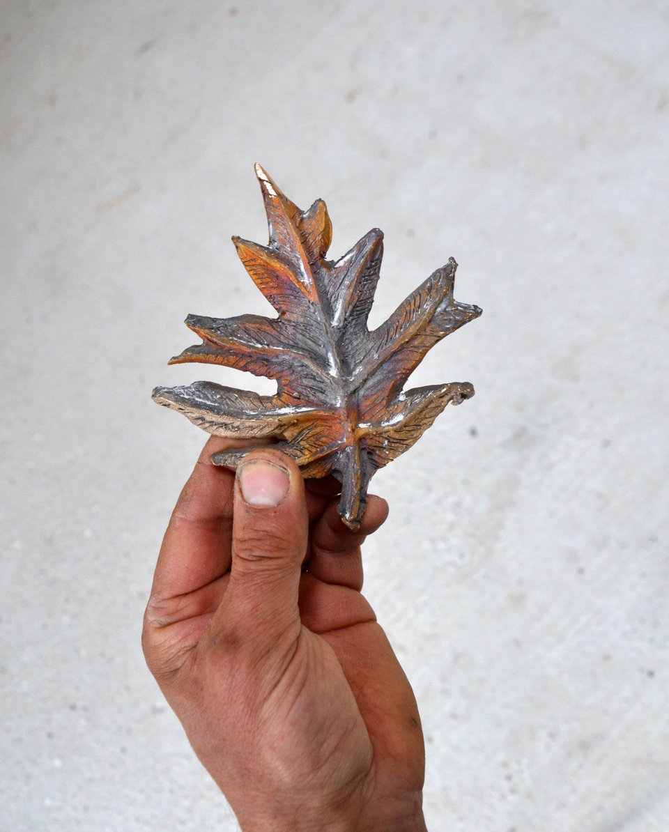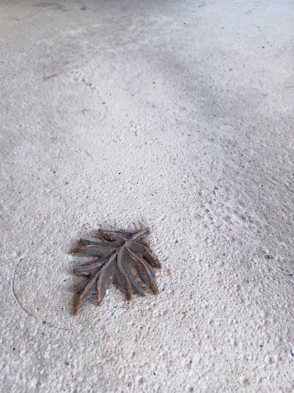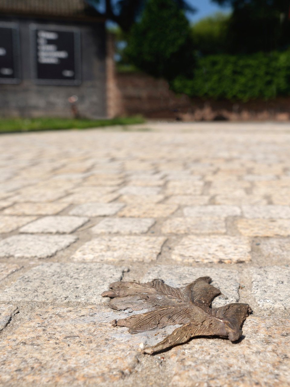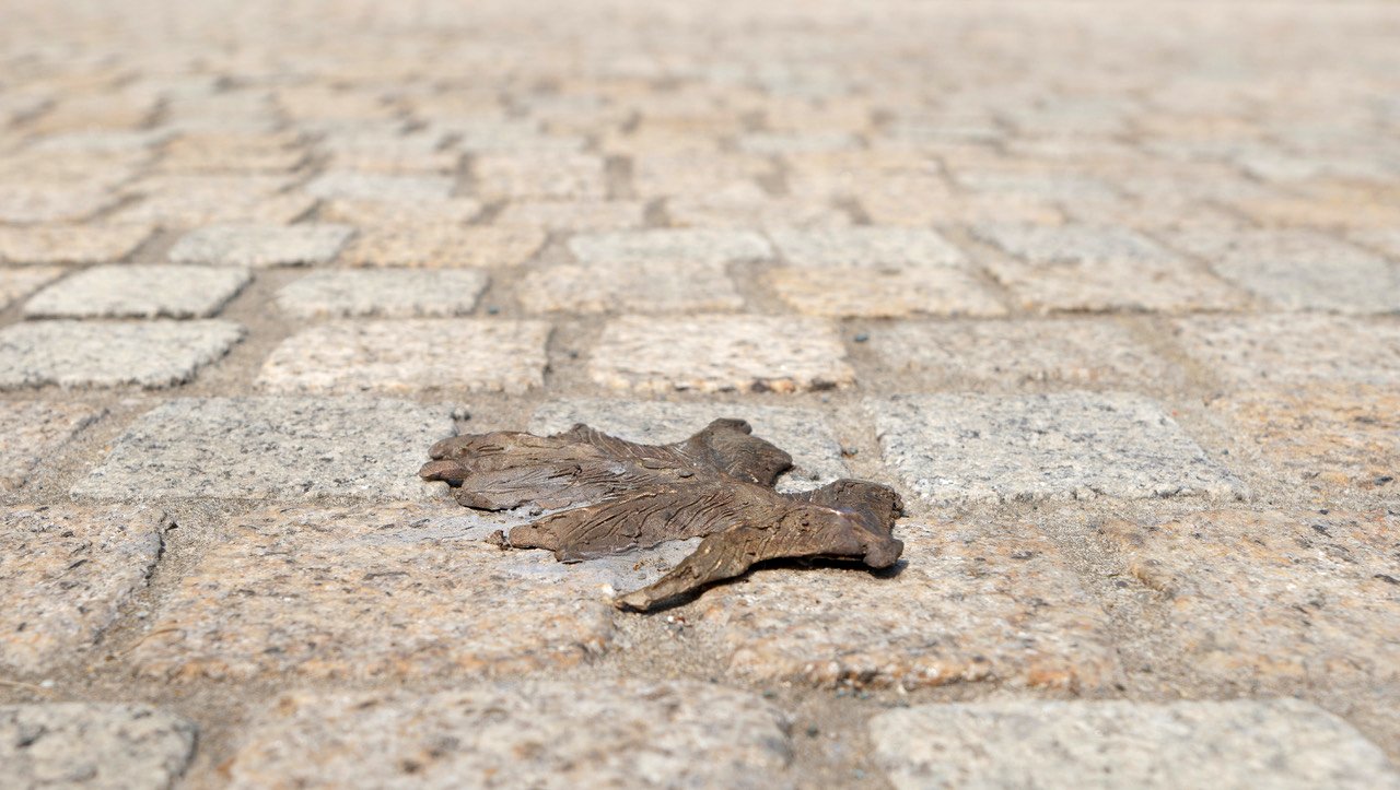 Series of unique bronze floor sculptures. Hand-moulded, unique bronze Quercus Palustris* leaves are anchored in an indoor or outdoor floor using an accompanying stainless steel wire rod. Walking on the sculpture creates a polished, golden layer. This revives the fallen leaf and gives it an aura like humus for new life.